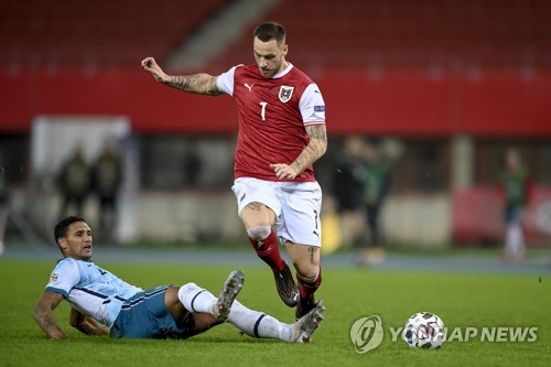 Ruben Gabrielsen of Norway (L) and Marko Arnautovic of Austria (R) in action during the UEFA Nations League League group B1 soccer match between Austria and Norway in Vienna, Austria, 18 November 2020. EPA/CHRISTIAN BRUNA